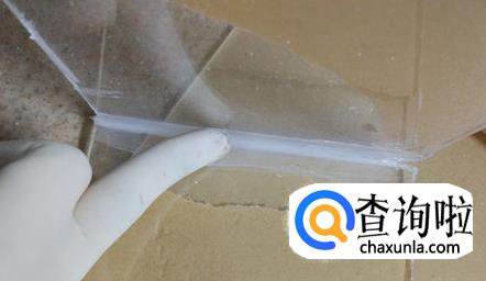 然后拿出两块相邻的玻璃板对接,用胶枪对着缝隙打上玻璃胶,一定要保持均匀,不能忽多忽少,尽量靠近缝隙,然后使用手套把胶抹匀