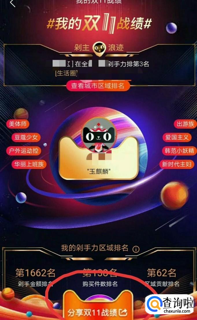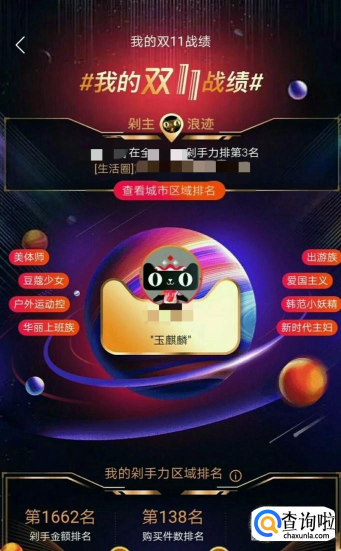 进入过后就可以看到自己的双十一战绩了,还可以看到自己在所在城市区域排名、剁手金额排名、购买件数排名、区域贡献排名,以及对购买个人的总体评价,还有荣誉称号哦!