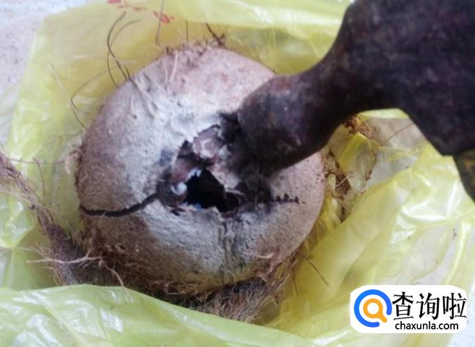 再用锤子把椰子敲裂,然后用小刀挖出果肉。