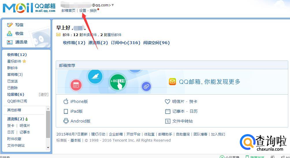 在你的QQ邮箱首页,找到位于最上面的“设置”,点击进入。
