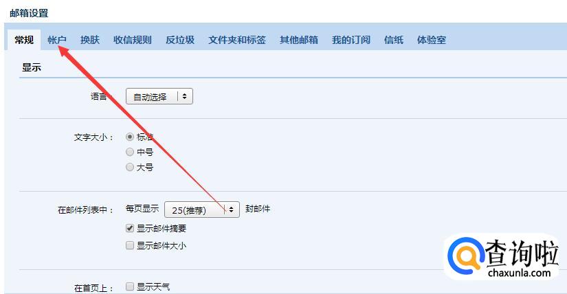可以在出现的邮箱设置页面看到“常规”设置,“账户”设置,“换肤”设置等多种功能,现在点击“账户”。
