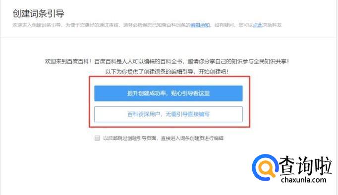 在“创建引导页”会有两个选项,如果你知道如何创建百度词条的就直接点击“百度资深用户,无引导直接编辑”。如果你之前没有用过百度词条的话,可以点击第一个选项,了解一下百度词条是如何操作的。