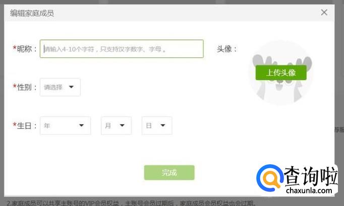 最后,我们输入家庭成员账号的昵称,选择好姓名、生日等信息之后,点击“完成”按钮即可添加成功。