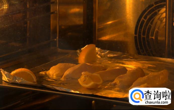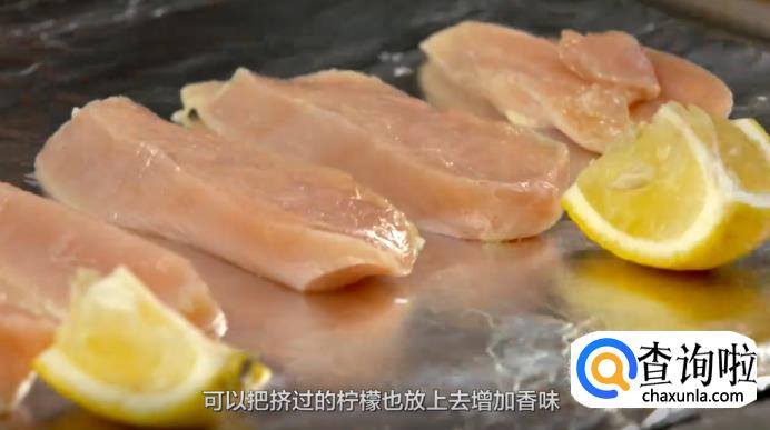 把腌制好的鸡胸肉放入烤盘中,可以把挤过的柠檬也放上去,增加香味。