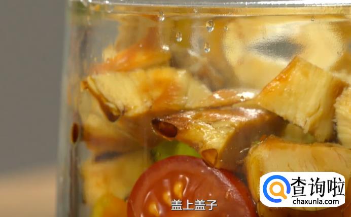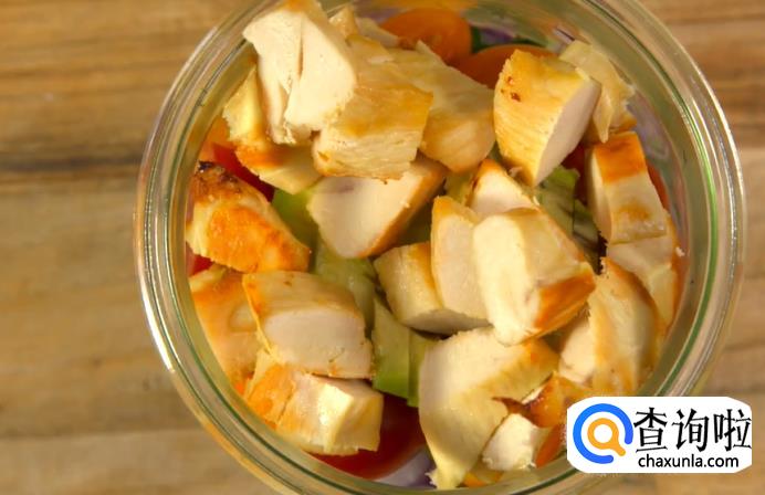 然后,将切好的鸡胸肉放进装蔬果的密封罐中,再加入一点柠檬汁、醋、橄榄油,再盖上盖子,用力摇晃混合。
