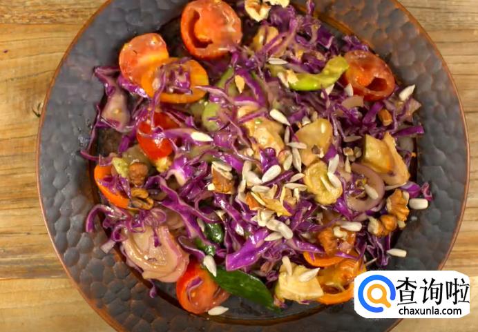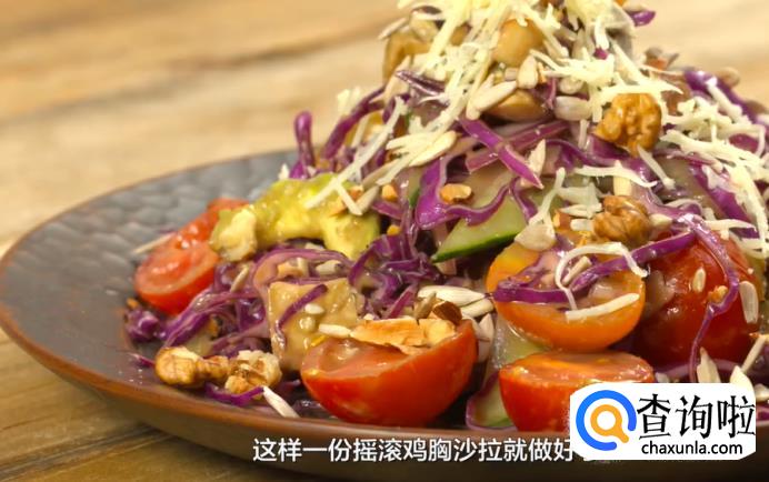 混合均匀后,打开盖子,将沙拉倒入盘中,再按照个人喜好加入坚果碎和干酪,这道摇滚鸡胸沙拉就完成了。
