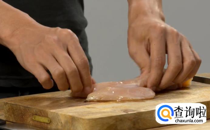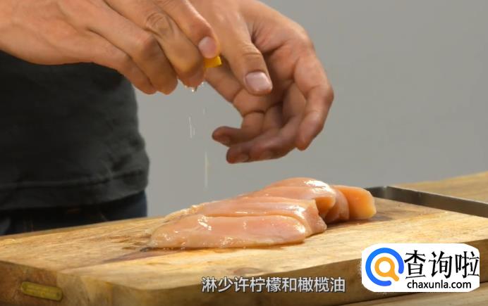 首先,需要处理鸡胸肉。将鸡胸肉切成2指宽的长条,再在切好的鸡胸肉上淋少许的柠檬汁和橄榄油,轻轻揉按,让鸡胸肉腌制入味。