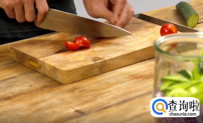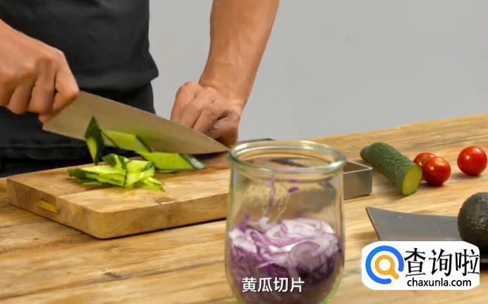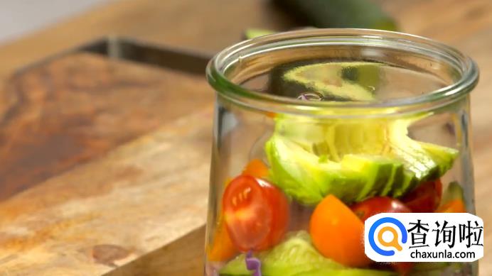 另外,再把黄瓜切成片,小番茄对半切开,半个牛油果切成片。将这些切好的水果蔬菜全部放入密封罐中。