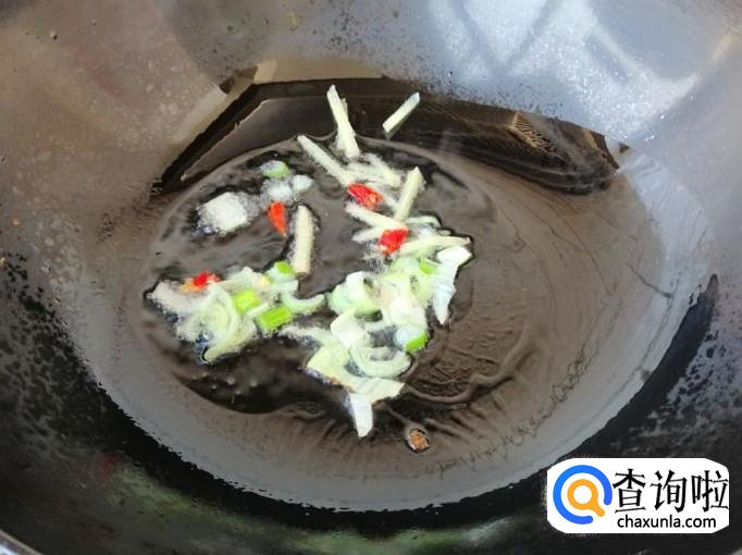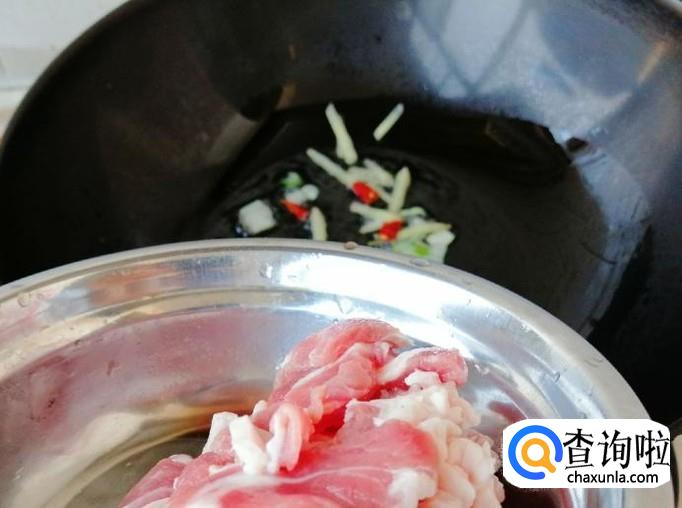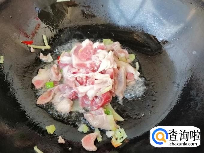 炒锅放油油热后,放入切好的葱花、辣椒、姜丝炝锅,炒出香味后,加入切好的羊肉片,用铲子翻炒均匀。