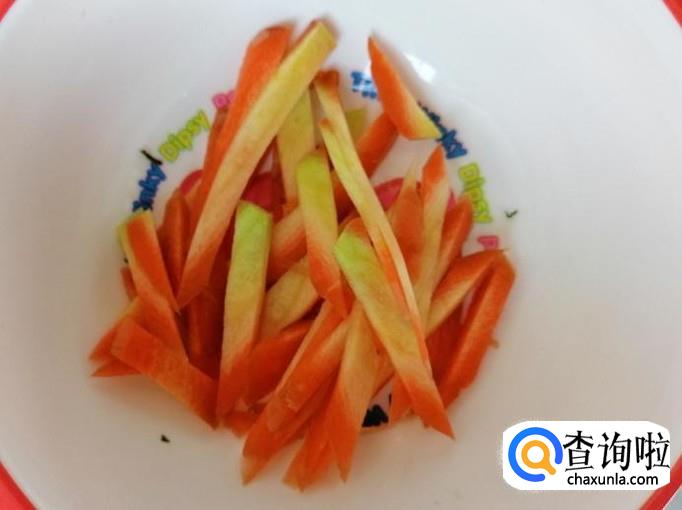 取一根新鲜的胡萝卜,用清水把胡萝卜洗净,然后用刀切掉胡萝卜两头,把胡萝卜切成细丝待用。