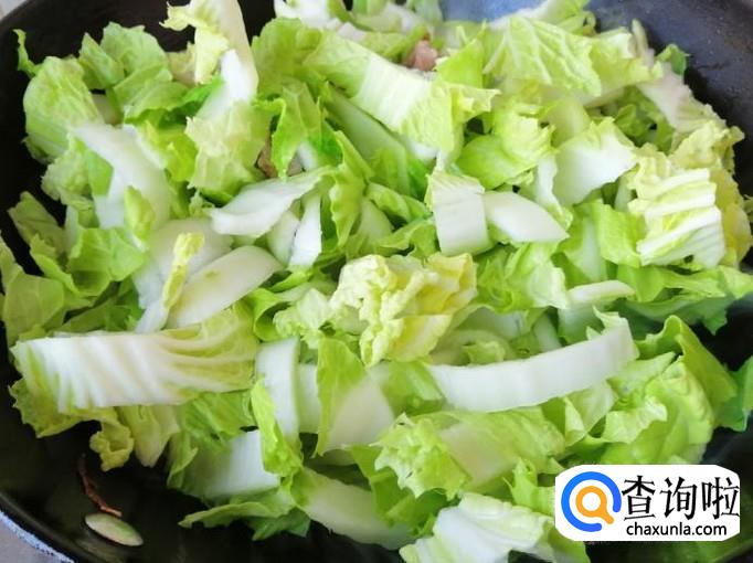 等羊肉炒至变色后,加入切好的白菜,用铲子快速翻炒均匀,因为白菜容易出水,所以炒制过程中不用加水。