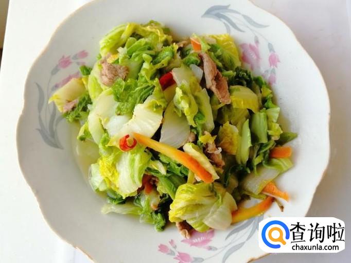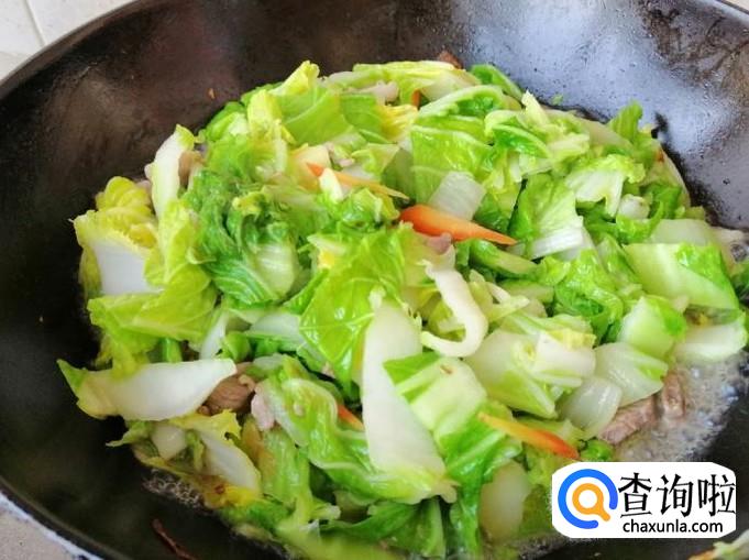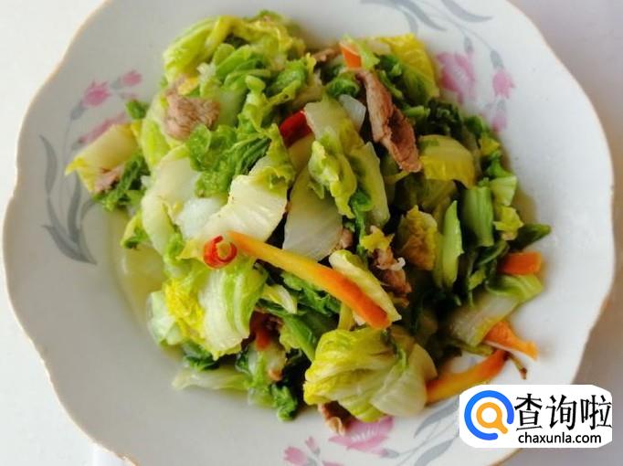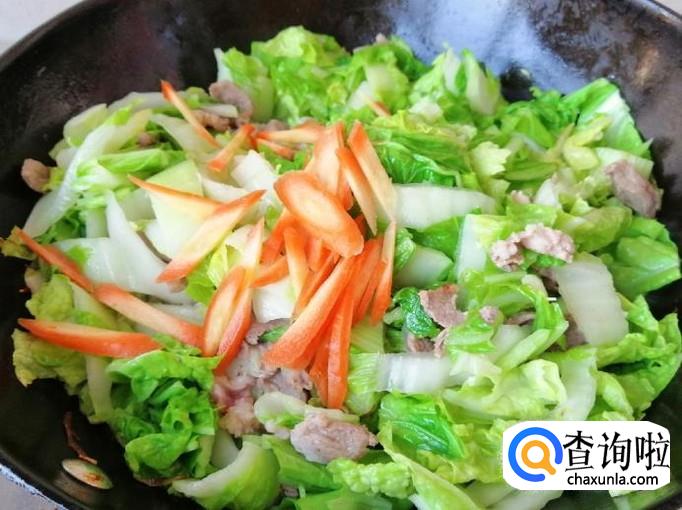 翻炒片刻后,加入备好的胡萝卜,继续翻炒均匀,我这里选用的白菜比较鲜嫩,特别容易熟,如图所示白菜胡萝卜炒羊肉就做好了,加入适量生抽和食盐,翻炒入味就可以了。