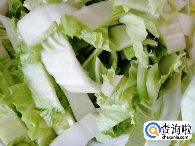 取适量新鲜的白菜,用清水把白菜洗净,把洗好的白菜用盐水泡一会儿,然后用水冲洗干净,放在菜板上,用刀切成白菜片,切好待用。