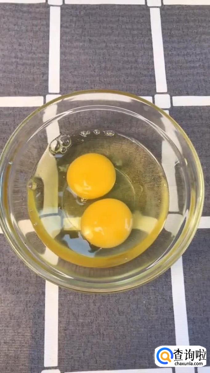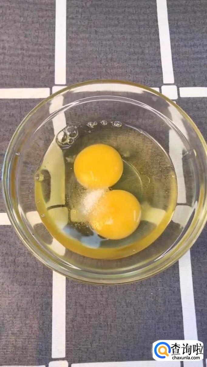 接着在碗内打入两个鸡蛋并加入少许盐,搅拌均匀,如下图所示。