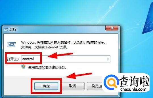 按住“Windows + R”键,弹出运行窗口,输入“control”进入控制面板,点击“确定”