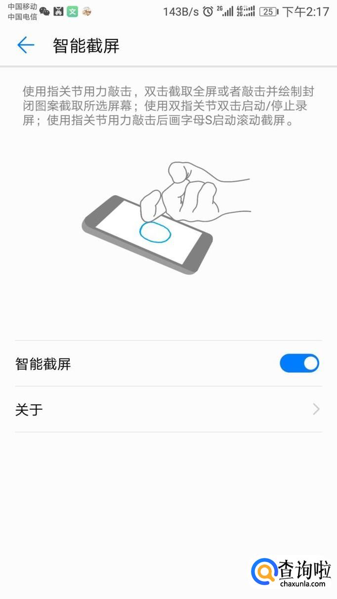 点击手势控制后,会出现如下图的页面,接下来点击智能截屏后,这样智能截屏就打开了,以后截屏就可以根据图上的提示操作进行截屏了