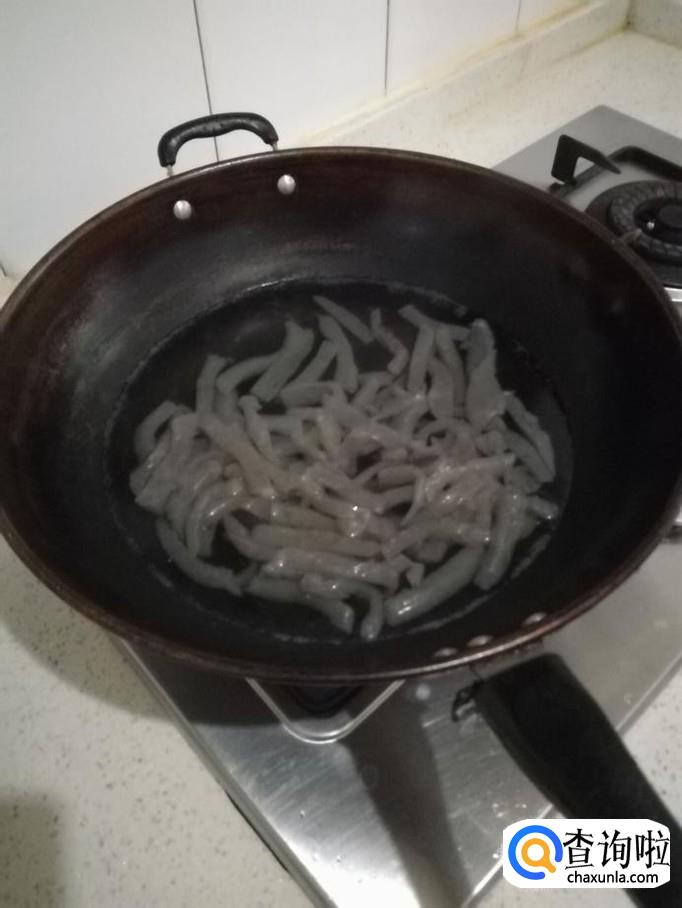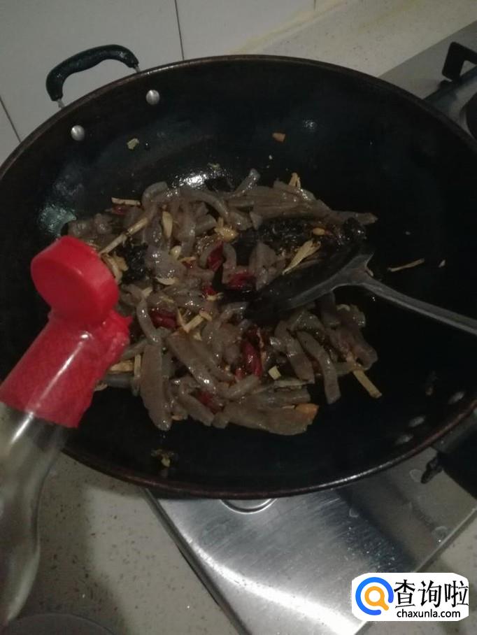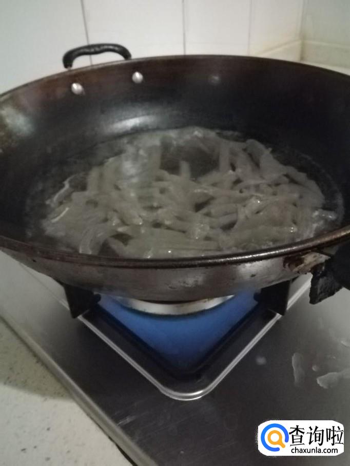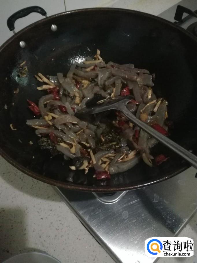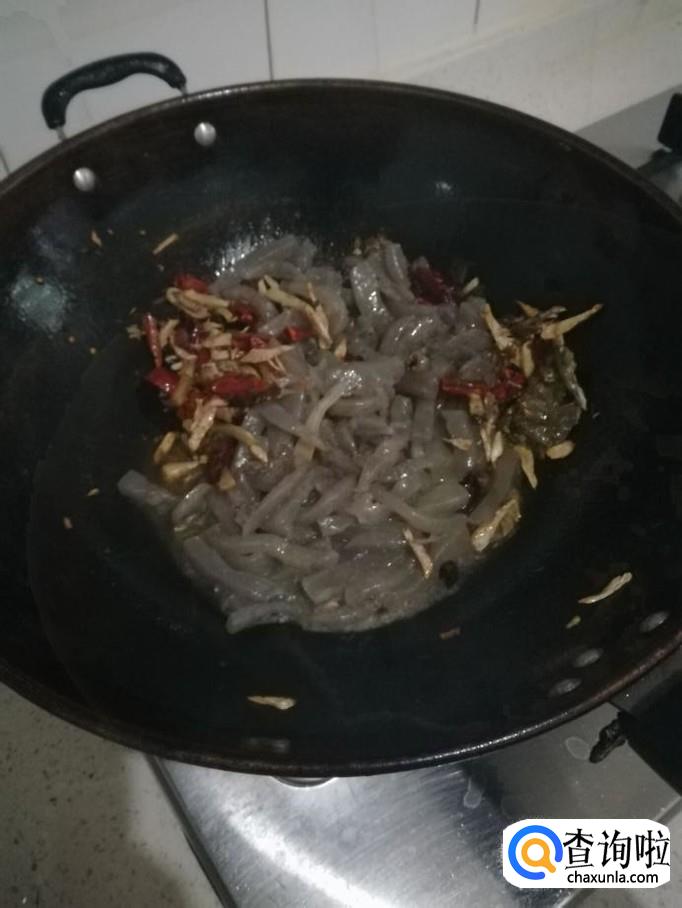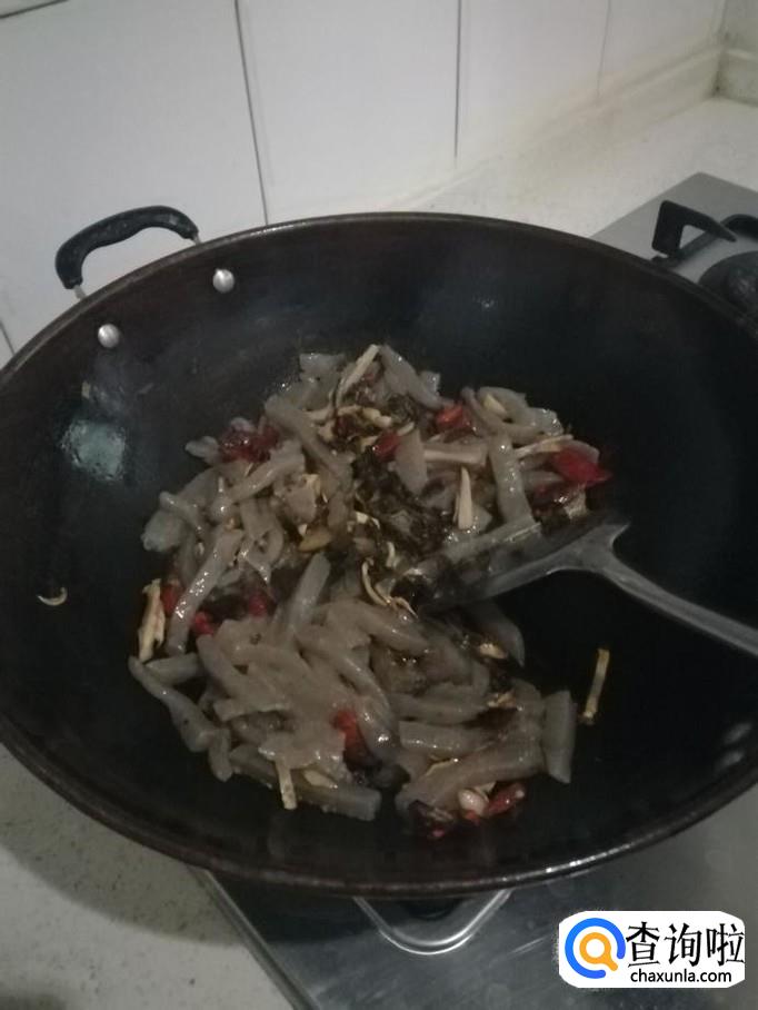 接着将煮好沥干的魔芋条倒入锅里,用铲子搅匀后并不停翻炒,大约需要翻炒2分钟左右。