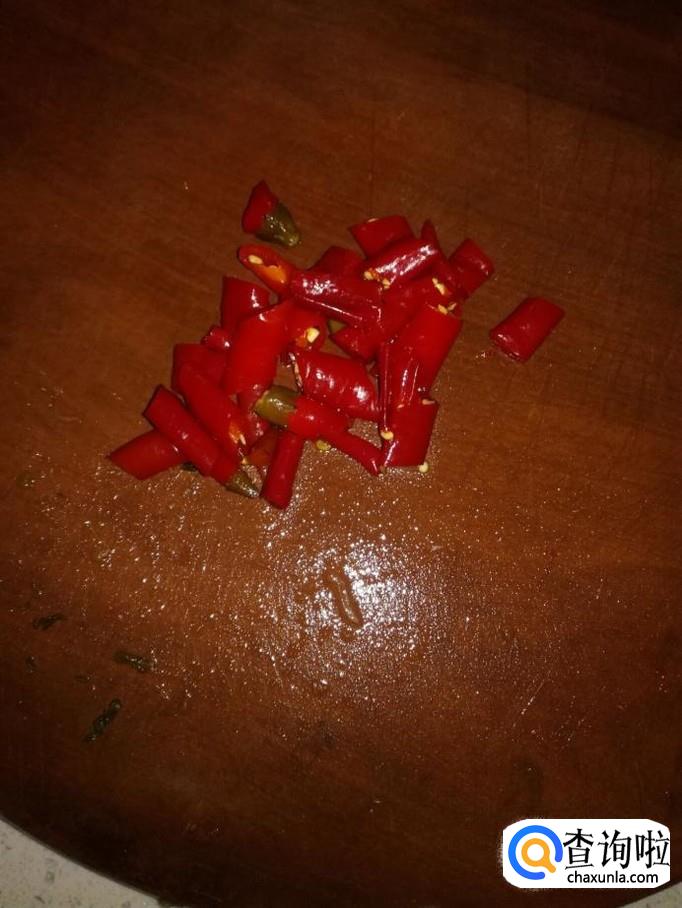 把泡海椒切成小段状备用。