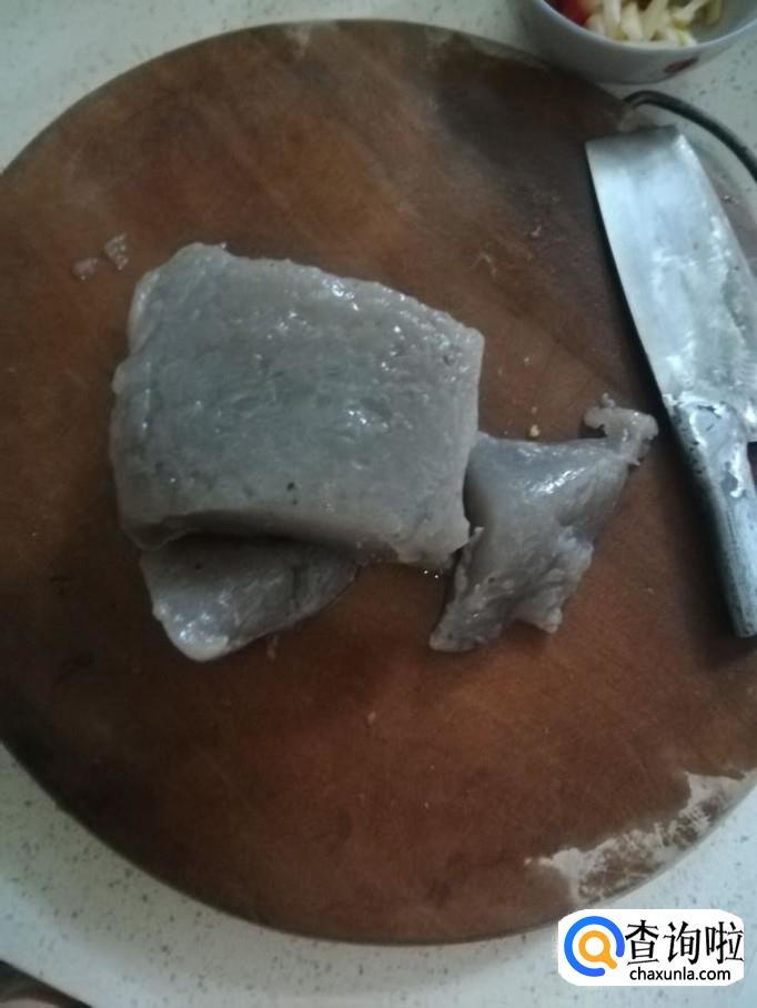 将熬制呈块状的魔芋洗干净,切成长条状,装盘备用。