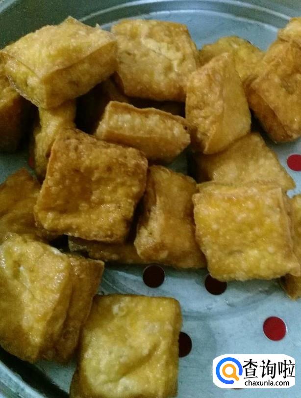 在锅里加入食用油,把豆腐一片一片放入锅中炸成金黄色,记住豆腐的两面都要炸,并且要掌握到火候,开中火炸豆腐,把炸好的豆腐就可以盛出来了。
