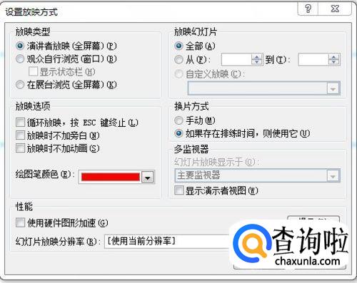 1、执行“幻灯片放映→设置放映方式”命令,打开“设置放映方式”对话框。