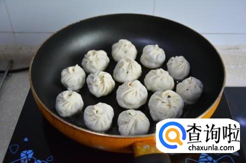然后往锅中调入适量的水,盖上锅盖进行焖制,直至把煎包煎熟后撒上葱花即可
