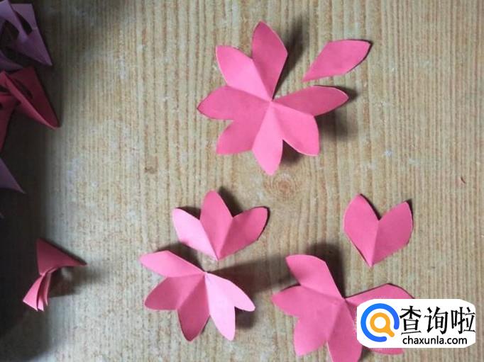 把所有的花瓣都粘完后,就像下面的图一所示,成了大小不一的花。然后再把每一层都粘起来,从最外面的一层开始粘,先在最大的一层花中点上乳白胶,有一次把花瓣粘上,每粘一层都要点一点乳白胶,这样粘的更紧,不易脱落。