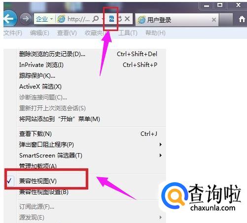 重新打开经过设置之后的网页,你会看到地址栏后面有一个像破碎纸片一样的图标,说明兼容模式已经设置成功,在工具的下拉菜单也同样可以看到在兼容模式前面也就打钩,说明网页的兼容模式已经设置成功。