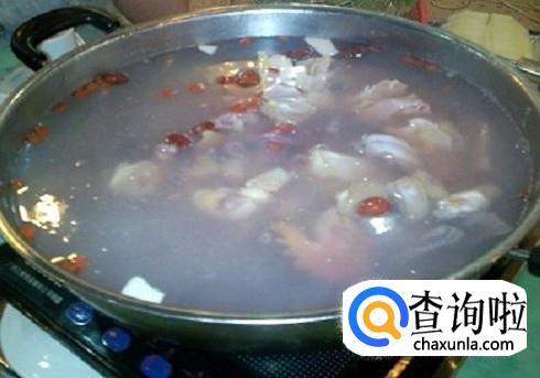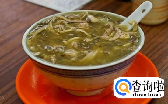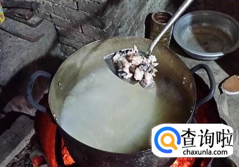 将洗好的雪菜倒入汤中,拆出的蛇骨和鸡骨倒回汤里再煲两小时。