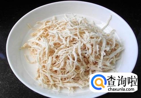 60分钟后取出蛇肉和鸡肉,将蛇肉撕成丝,鸡肉切成丝备用。