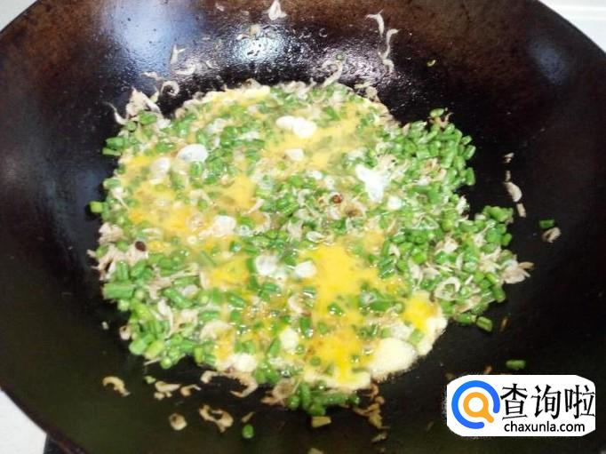 炒至豇豆变软,放入味精,然后把鸡蛋液浇到豇豆上。鸡蛋液凝固以后,把鸡蛋滑散与豇豆融合一起即可,关火出勺。