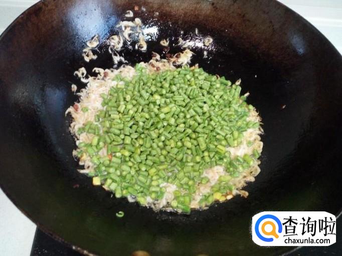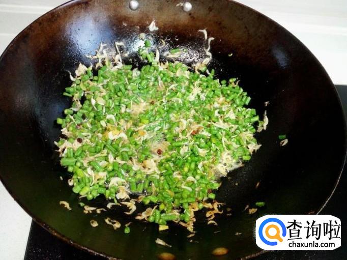 放入豇豆翻炒,放入盐(不是脱盐的虾皮要慎重放盐)。