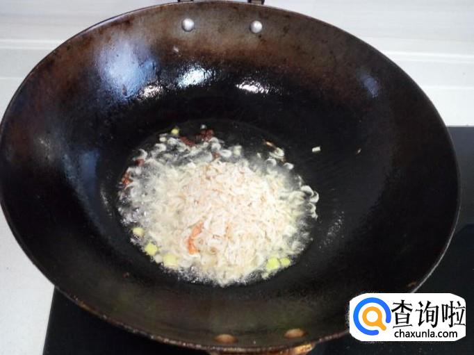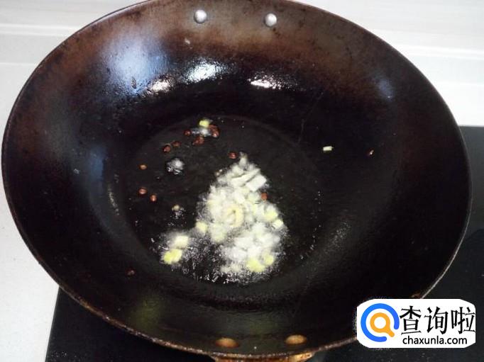 锅内放入油加热,油热后放入花椒,葱,姜,爆锅,放入虾皮小火翻炒,炒出香味。