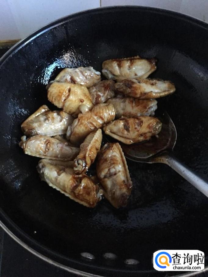 锅中加入适量植物油,倒入半勺白糖,白糖融化后放入焯过水的鸡翅,小火煎出油,这样做出来之后不油腻。