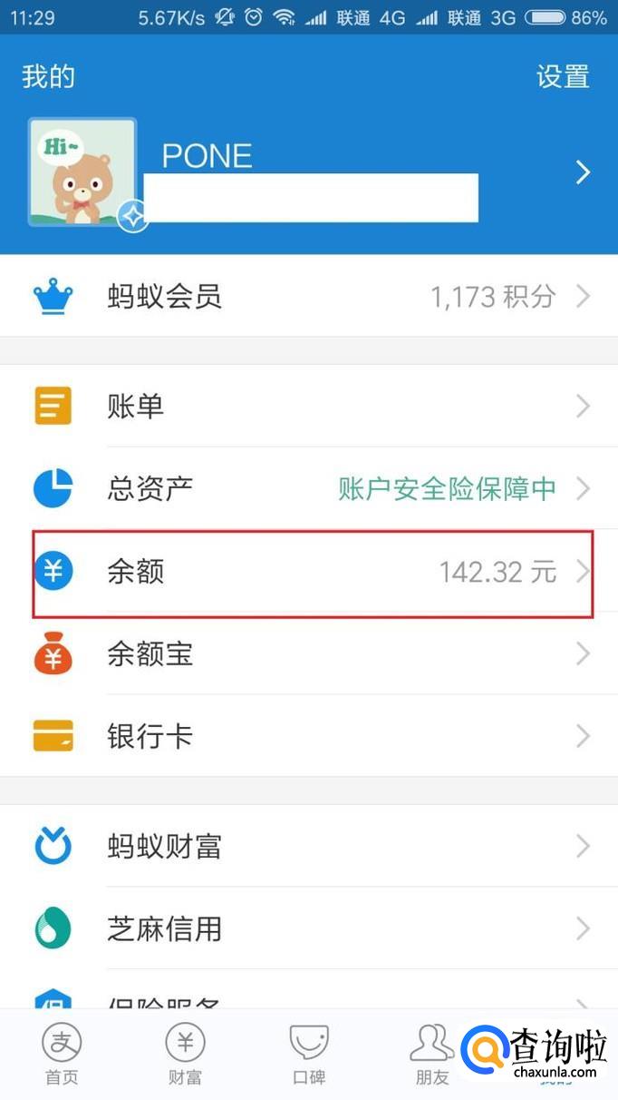 接下来,在个人中心页面中可以看到支付宝账户信息,点击“余额”选项。