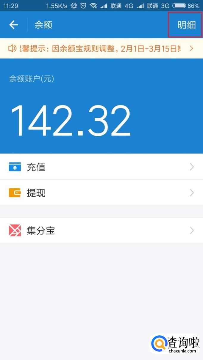 打开余额页面之后,可以查看到的当前账户中存储的金额,点击右上角的“明细”按钮,可以查看资金明细。