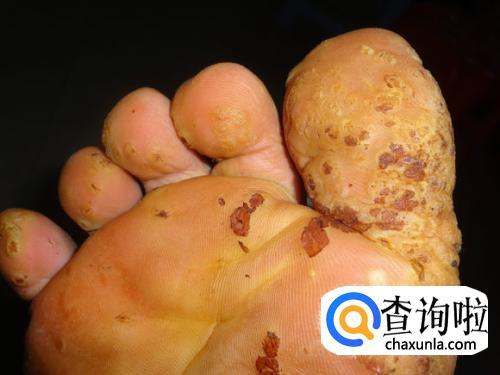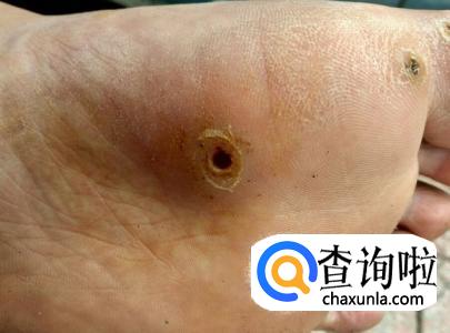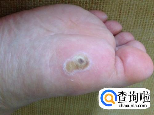 跖疣早期为细小发亮丘疹,绿豆大小,表面角化粗糙,灰黄或污灰色,周围境界清楚,绕以增厚的角质环,如用小刀将表面角质刮,表面可见出血点。足底皮损呈圆形乳头状角质增生,周围绕以增厚的角质环,削去表面角质层,其下有疏松角质软芯,可见毛细血管破裂外渗凝固而形成的小黑点。若含有多个角质软芯称为镶嵌疣。为大家展示一组跖疣不同程度的照片。