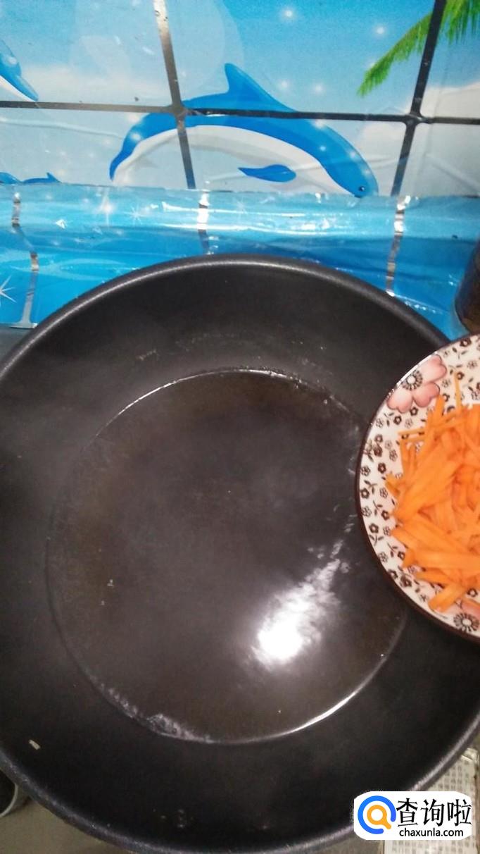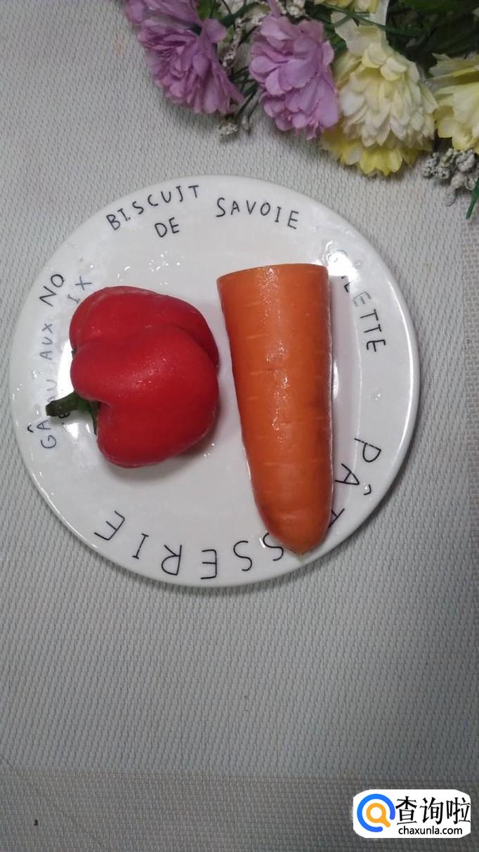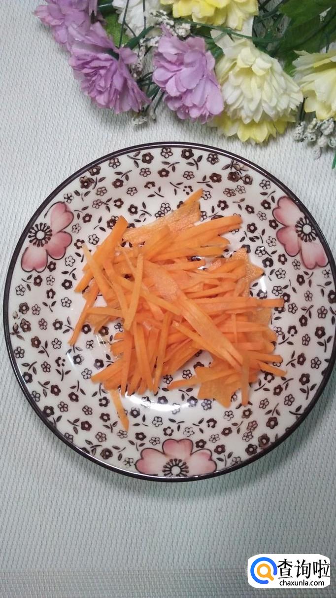 将适量胡萝卜和红椒洗净,将胡萝卜切成丝,放入锅中焯水,还可以用模具刻几个胡萝卜花备用。
