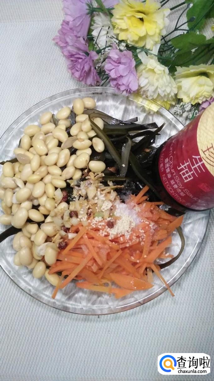 黄豆适量,海带适量,青红椒适量,胡萝卜适量,长四两,蒜适量,花椒适量,盐适量,鸡精适量,五香粉适量,生抽适量,香醋适量。