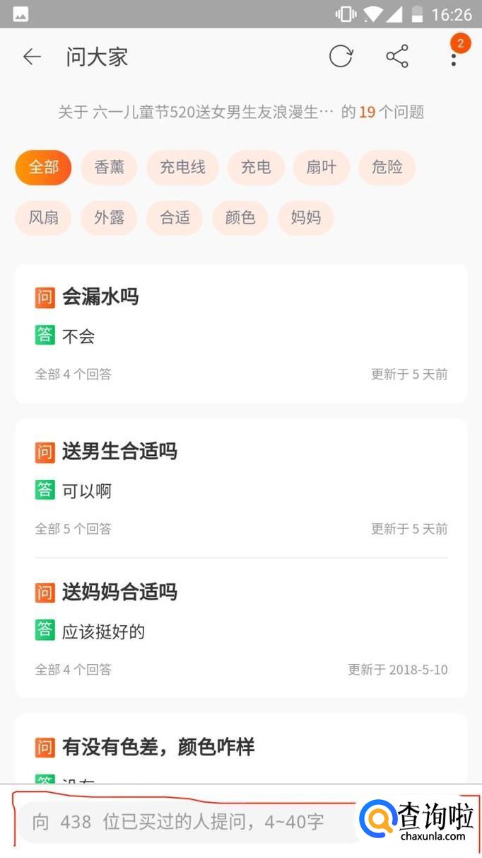 进去后,最底端有输入的文本框,可以问自己想要问的问题,等待其他买家回答