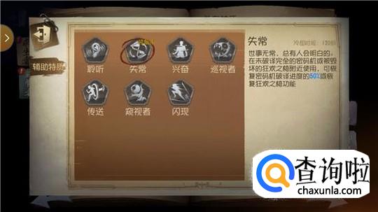 开始游戏是,进入大厅等待是,可以根据求生者选的角色来临时换特质和天赋,这样会有意想不到的好处。比如如果有园丁的话,可以换上是“失常”这个特质,可以恢复密码机破译进度的百分之50或者恢复狂欢之椅的功能,有这个技能就不会发生抓了人却没法将它放上椅子的尴尬局面了。