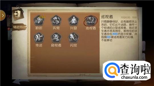 特质一共有7种,如果是高端玩家的话,建议选择带巡视者(操作一个快速的小型巡视者,接近求生者并将其包住,被抱住的求生者会在20秒内显示轮廓,并每隔五秒被巡视者发力纠缠,不能移动,冷却时间90秒)。这个特质可以让小丑在游戏前期速度的找到求生者,并且更容易击打到求生者。