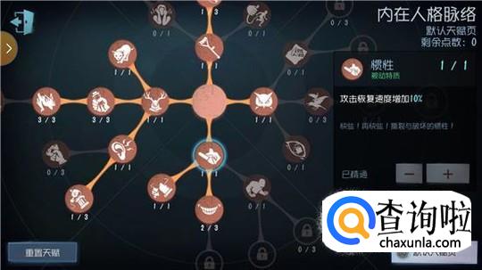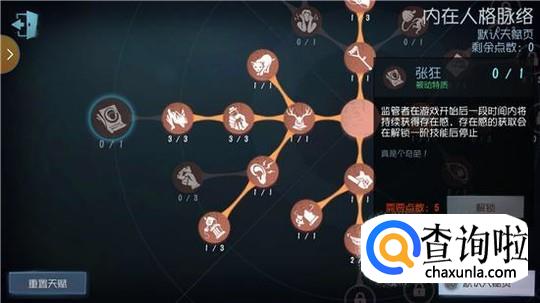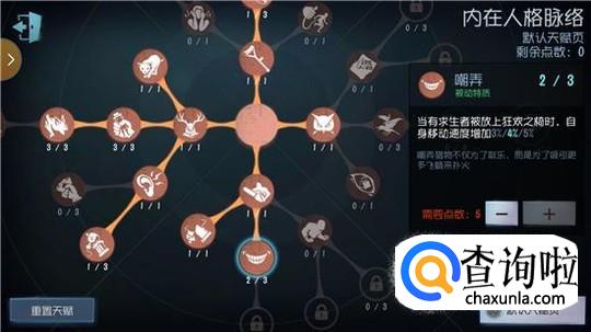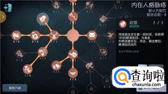 然后来看一看怎么带天赋,如果人格等级够高的话,一定要把“张狂”点出来,在一开局就会拥有存在感,这样可以让他更快的解锁技能。“嘲弄”、“追猎”、“惯性”,这三个天赋是玩屠夫必定要点出的,其它的看个人喜好了。