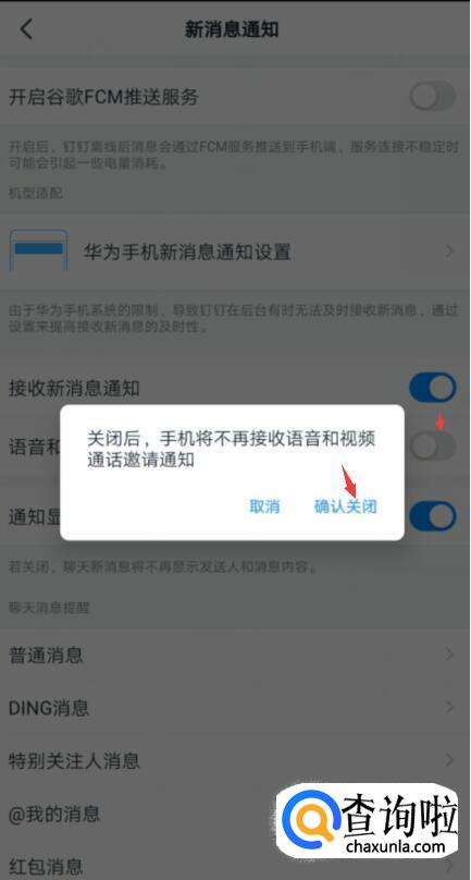 我们将后面的按钮点击一下,将其变成灰色,然后点击确认关闭即可关闭语音和视频通话邀请通知。
