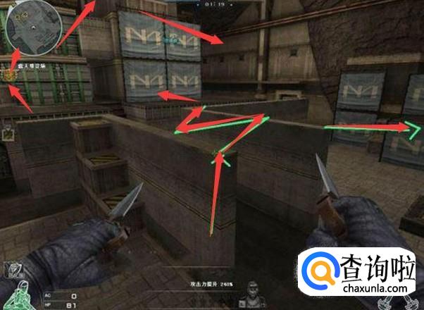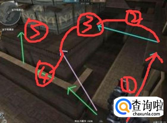这个是集装箱上面的高台上开始跑,我大致的路线标注了,顺序,到达步骤五的时候,可以再跳回来,也就是说,从五可以再跳回四从四跳到开始的位置,不过有的人不会从四跳到起跳的位置,多加练习就能做到,这用超级跳就可以做到。