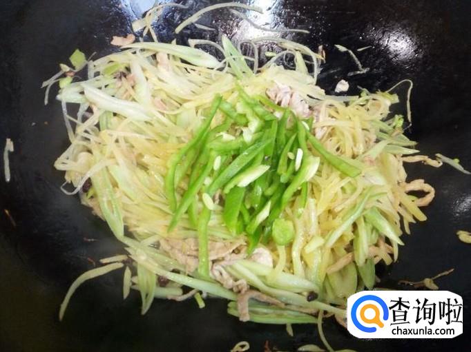 土豆丝炒至断生,放入青椒丝略翻炒一下,放入味精,关火出勺。