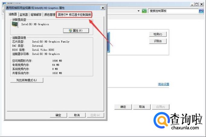 点击高级设置选项,在弹出的对话框内找到因特尔核心显卡控制面板选项,如图所示: