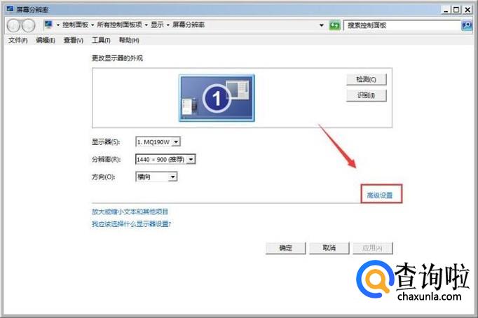点击屏幕分辨率选项,在弹出的对话框内找到高级设置选项,如图所示: