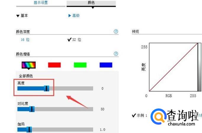 点击颜色选项,在弹出的对话框内找到亮度选项,调节亮度的滑块就可以对电脑屏幕的亮度进行调节了,如图所示:
