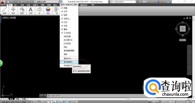启动AutoCAD 2014辅助设计软件,如图所示。点击自定义快速访问工具栏向下箭头,弹出下拉列表选择"显示菜单栏"项。